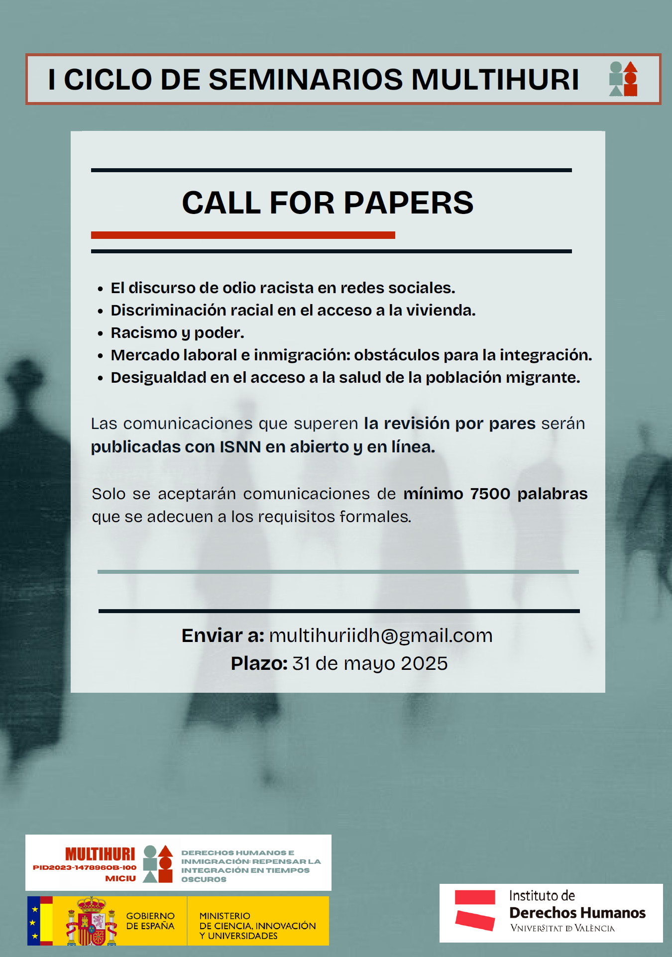 Con motivo de la celebración del I Ciclo de seminarios MULTIHURI en la Universitat de València, desde el grupo de investigación del proyecto MULTIHURI queremos crear un espacio de debate sobre los problemas que plantean la xenofobia y el racismo para la integración de colectivos racializados o de las personas desplazadas en momentos de auge del nativismo populista. Las comunicaciones presentadas serán sometidas a un proceso de revisión por pares y, en su caso, posteriormente incluidas en una publicación con ISSN que estará disponible en abierto y en línea.